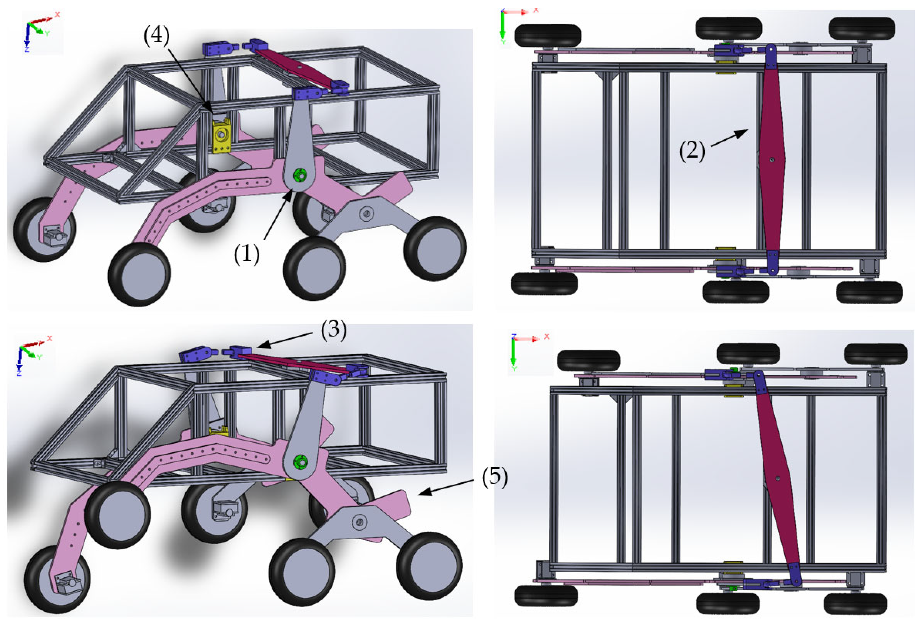 The 3D design of Hygrobot. Detail of movement range for overcoming obstacles: (1) ZX pivot points, (2) differential bar, (3) joint-based connection system, (4) YX pivot points, and (5) ZX arm for connecting the three X-axis-aligned wheels.
