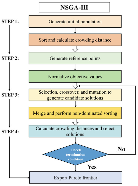 22]. Despite its advantages, NSGA-III often produces a large and widespread solution set, making it challenging to identify the optimal solution with the best overall performance.