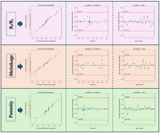 Figure 6 illustrates the normal distribution of the residuals from the response surface model. Residual analysis is a statistical technique used to evaluate the reliability of a model by examining the residuals and associated statistical metrics. A distribution of residuals that closely approximates a normal distribution indicates a good model fit, suggesting that the model has effectively captured the underlying patterns and trends within the data. The closer the observed data points are to the reference line in the plot, the better the model’s alignment with the equation. The normal probability plot reveals that the scatter points are uniformly distributed around the line, further confirming that the residuals conform to a normal distribution and that no significant outliers are present.