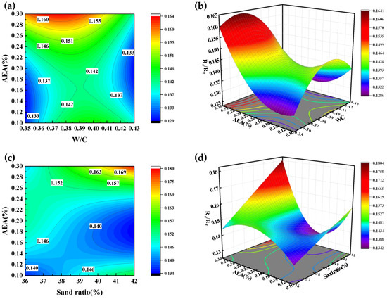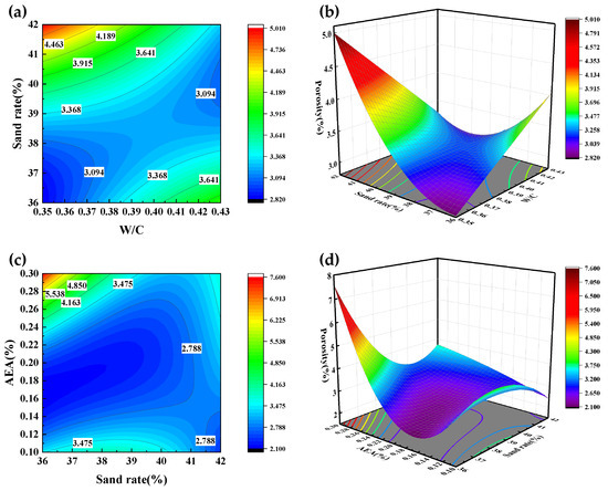 Figure 12c,d, the relationship between the sand ratio and AEA reveals a clear trend. The lowest porosity occurs when the sand ratio is between 36.0% and 38.0%, and AEA is between 0.160% and 0.180%. The optimal sand ratio efficiently fills the gaps between the coarse aggregates, improving the overall compactness of the concrete. Simultaneously, a moderate AEA introduces fine air bubbles that refine the pore structure without overwhelming it, maintaining a uniform pore distribution and minimizing porosity. When the sand ratio exceeds the optimal range, the proportion of coarse aggregates decreases, weakening the aggregate structure and causing the porosity to increase. Similarly, when AEA is excessively high, excessive air bubbles lead to a more complex pore structure, resulting in increased porosity.
