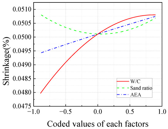 Figure 9 presents the response trajectories of shrinkage as influenced by W/C, sand ratio, and AEA. Shrinkage showed a positive correlation with W/C, with higher W/C leading to increased shrinkage, though the rate of increase diminished at higher levels, suggesting a non-linear behavior. For the sand ratio, shrinkage initially decreased as the ratio increased from 36.0% to 39.0%, but this trend reversed with further increases from 39.0% to 42.0%, resulting in a sharp rise in shrinkage. In contrast, higher AEA consistently led to higher shrinkage values. Among the factors studied, W/C had the most significant impact, followed by the sand ratio and AEA.
