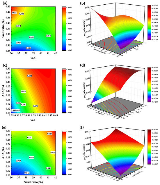 Figure 10e,f highlight the dominant role of the sand ratio in shrinkage, with the lowest shrinkage observed at a sand ratio between 36.0% and 37.0%, and an AEA close to 0.100%.