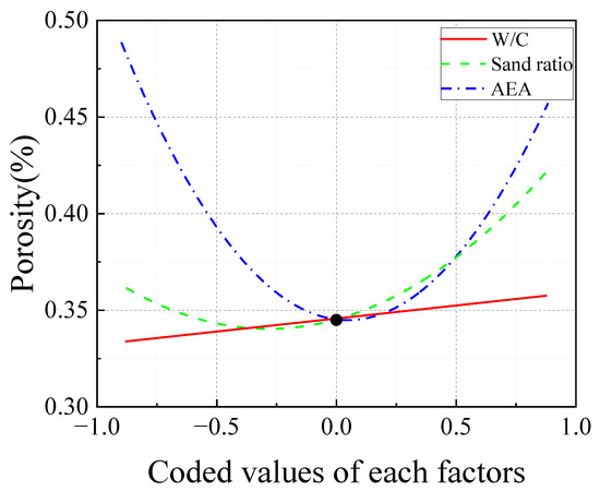 Figure 11 illustrates the response patterns of porosity to variations in W/C, sand ratio, and AEA. A positive correlation is observed between W/C and porosity. Within the range of 36.0~38.0% sand ratio, porosity decreases, while it increases as the sand ratio extends from 38.0% to 42.0%. Porosity decreases with the increase in AEA from 0.100% to 0.225% but continues to rise as the AEA exceeds the threshold. By analyzing the curvature, AEA exerts the most significant effect on porosity, exhibiting a pronounced non-linear trend, followed by the sand ratio and W/C.