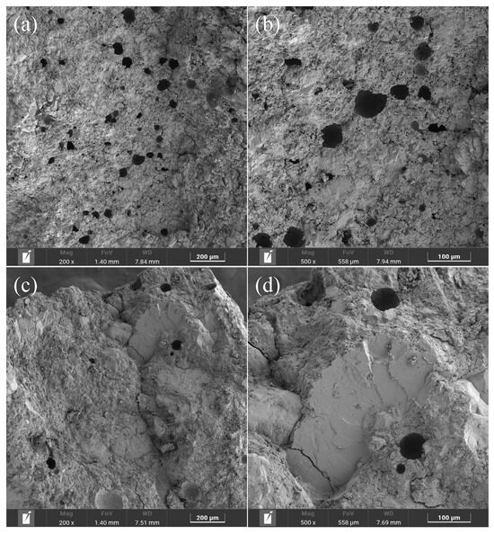 Figure 14a,b) contains a higher number of pores, characterized by larger, irregularly shaped voids. Larger pores reduce the mechanical strength and durability of the concrete, primarily affecting compressive strength and permeability resistance. They create weak zones within the concrete matrix, making the material more susceptible to changes in shrinkage and overall structural integrity, particularly over prolonged exposure to environmental conditions. In contrast, the concrete with optimized mix proportions (