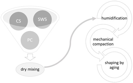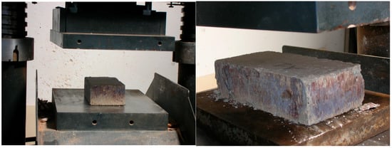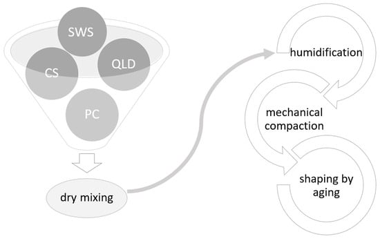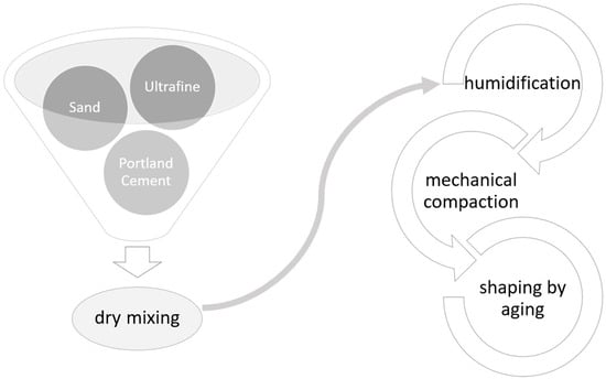 The production cycle proposed here includes the same steps as those used in the production of structural artificial stone: dry mixing of the raw materials, humidification with a quantity of water limited to that necessary for amalgamation, introduction into molds, mechanical compaction, and shaping by the aging of the elements [44].