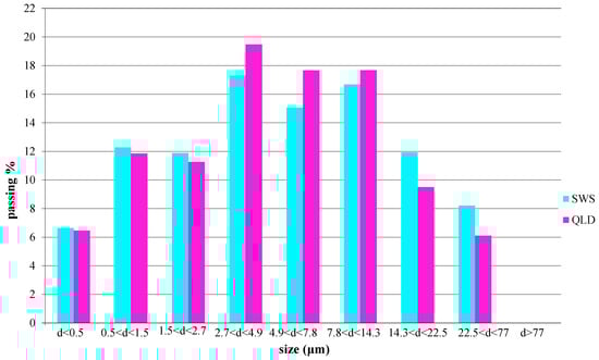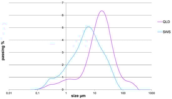 In contrast, the particle sizes of the two types of waste analyzed were slightly different (Figure 2 and Figure 3). Although they are mostly ultrafine materials, it appears that SWS contains the largest amount of ultrafine material, while QLD produced for the production of concrete aggregate tended to be slightly larger in diameter.