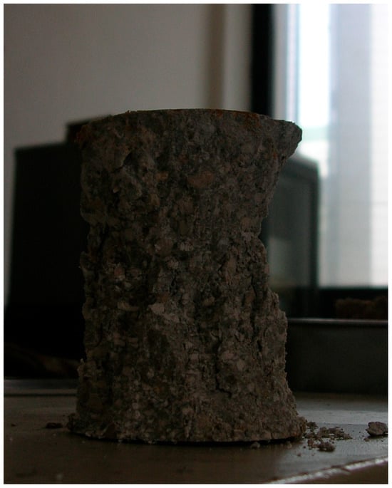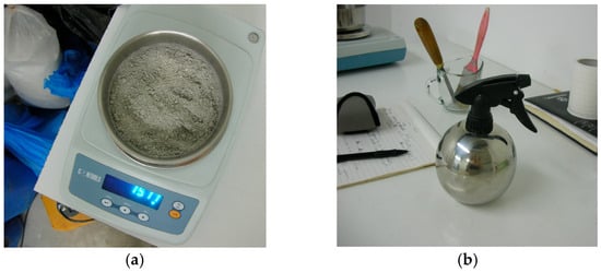 The degree of compaction of the materials was then tested to find the maximum load beyond which the volume loss of the two samples was insignificant. For this purpose, two slurries were prepared with one of two types of waste, cement and water. The resulting information was used to determine the compaction pressures to which the specimens would be subjected in the next steps. Each slurry, following the research settings initiated by Prof. Galetakis [42], consisted of 80 g of recycled aggregate and 15 g of Portland cement mixed dry and moistened with enough water to make the slurry wet (Figure 4).
