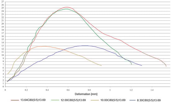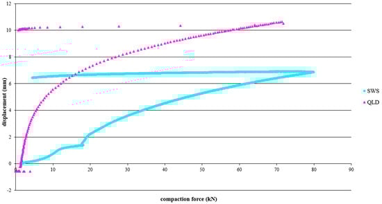 The results obtained (Figure 6) highlight that the specimens containing QLD had an initial settlement of about 50 percent of the total, which occurs very quickly and at small load increments, while the compaction values of the specimen containing SWS were lower, the process occurring more slowly than at higher pressure values. This again reflects the different grain size of the SWS, which is finer than the powders and therefore has a better initial grain distribution with fewer voids, even before the compaction stage. It could be observed that the relative decreases became insignificant after the application of forces of 60–70 kN for SWS, and 50–60 kN for QLD.