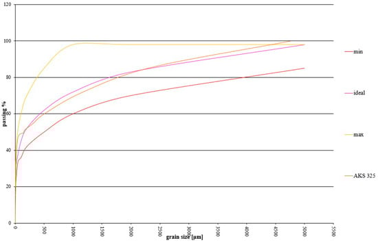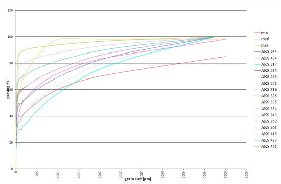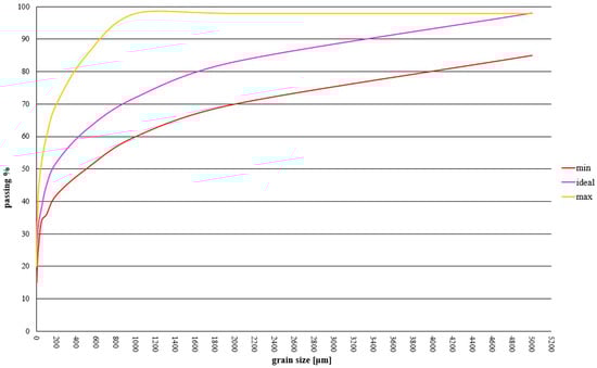 For a correct particle size distribution, an optimal reference curve [53] is provided, which generates a relatively large particle size range within which deviations from the ideal curve are possible (Figure 7). However, it is advisable to achieve as close as possible the ideal values and to minimize deviations in the silt range from 0.05 to 0.005 mm.