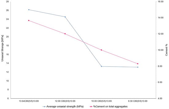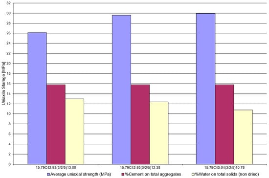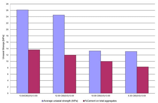 The mixes were prepared by manually mixing the dry materials, then wet mixing with water spray, amalgamating, and then placing them in the appropriate molds. Compaction was then performed, according to the results of the stress–strain cycles, by applying a force of 56.74 kN to the ram, resulting in an average surface tension of 43 MPa. At the end of the compaction process, the specimen was removed from the mold and placed in a humidity-controlled chamber for 28 days to cure (100%) according to UNI EN 12390-2:2019 [54].