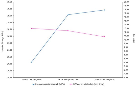 The percentage of W, which was slightly higher than the maximum percentage used in previous doughs, was determined via further testing to verify the workability of the dough. These tests were necessary because the raw materials in the dough had changed, in particular the amount of SWS present, which is a finer material than QLD; therefore, a slightly higher amount of W was required to be kneaded.