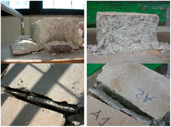 The analysis of the failure mechanism of the specimens (Figure 23) showed failure surfaces according to the indirect hyperboloid. In addition, the surface that failed along all four sides of the block had very small thicknesses compared to the surface of the entire specimen, while the core of the specimen remained intact and compact.
