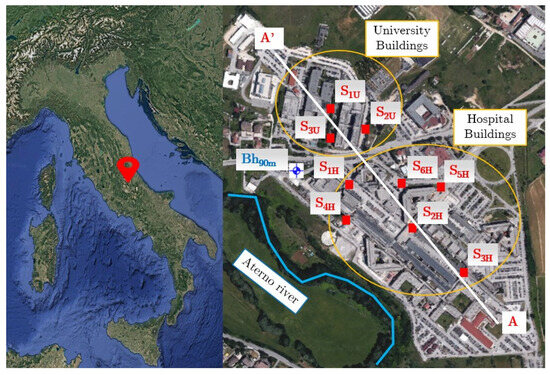 From the perspective of the buildings in the study area, it is important to consider the findings of structural studies conducted on the San Salvatore Hospital and the University of Coppito campus. Some authors [22,23] have assessed the overall condition of the hospital buildings, revealing a heterogeneous level of criticality. The building plan is highly irregular, consisting of several independent reinforced concrete substructures separated by seismic joints. Generally, the joints are designed to ensure regularity in structural rigidity and mass distribution. After the 2009 L’Aquila earthquake, in addition to limited and localised structural damage to portions of three buildings, the most significant systemic issue was with the seismic separation joints. These joints failed to function properly due to inadequate seismic design. The accurate design of seismic joints requires a detailed assessment of the displacements that may occur during a seismic event. These displacements are influenced by the seismic forces acting on the structure and the specific characteristics of the modal behaviour of both the soil and the structure. The university buildings [24] consist of six reinforced concrete substructures separated by seismic joints, and they have distinct H-shaped and C-shaped configurations. Four of the buildings are characterised by geometrical regularities, both in plan and elevation, while the two central structures exhibit higher irregularity. Numerical and experimental analyses [25] were conducted on one of the irregular buildings, revealing three main modal frequencies and shapes: the first mode is translational in the X- and Y-directions with a frequency of 2.7 Hz, and the other modes are roto-translational with frequencies ranging from 2.9 to 3.8 Hz.