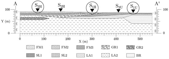 Geological–geotechnical study section A–A’ with soil material classification from boreholes and VS profiles from SDMT shown in Figure 3. The sites with VS inversion profiles are indicated in the circles.