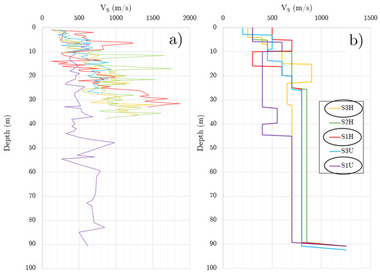 Figure 3a presents all the superimposed VS profiles from the backfilled boreholes shown in Figure 1, while Figure 3b displays only the VS profiles appropriately averaged according to the stratigraphy corresponding to the studied A–A′ section. It is important to emphasise the characteristics of the profiles within the hospital area (H): (1) S3H shows a slight inversion of VS (over −20 m); (2) S2H shows a VS increasing with depth; (3) S1H shows a shallow inversion of VS. Instead, the profiles included within the university area (U) have the following characteristics: (1) S3U shows a VS increasing with depth; (2) S1U shows a significant surface inversion for a thick layer.