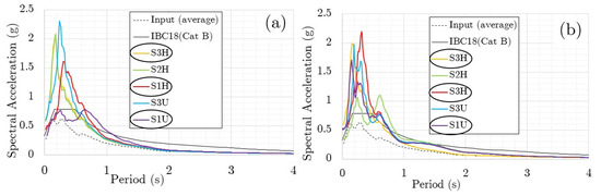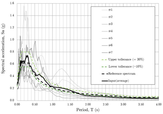 Figure 4 and Table 2 present the input motions, which consist of seven unscaled horizontal natural records selected from the ITACA archive [16]. The average of the selected spectra complies with the Uniform Hazard Spectrum (characterised by a return period TR = 475 years) at rock conditions referred to as subsoil class A, in the 0.1–1.5 s period range for the study area, as proposed by the IBC. Figure 5 also shows the corresponding 5% damped response spectra, including a comparison between the average input spectrum and the reference shape of the IBC. The acceptance limits chosen for the average spectrum were +30% for the upper one and −10% for the lower one, relative to the reference spectrum. The selected set of accelerograms is considered representative as it is based on the seismic hazard analysis provided by the NTC, which identifies potential seismic scenarios that may occur within a predefined time interval at the given site. Furthermore, the use of natural accelerograms (recorded) is preferred as they better reflect the seismogenic characteristics of the study area.