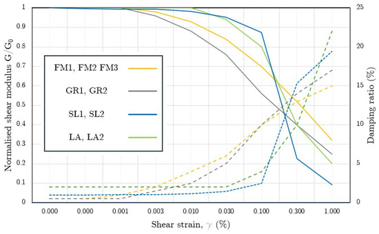 G/G0–g and D–g curves used in the 1D and 2D numerical modelling.
