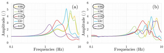 The TFs shown in Figure 6 reveal different trends for the 1D and 2D models. In general, 1D analyses amplify peaks at higher frequencies. This effect is influenced by the magnitude of the soil D, the method by which D is implemented in the numerical code, and the level of shear deformation induced in the soil during an earthquake. For sites exhibiting velocity inversion (S3H, S1H, and S1U), 1D models yield slightly lower values (f0) than those provided by the 2D analyses. Notably, only the 2D analyses are capable of capturing the second mode frequency (f2) at two sites: S3H and S1U.