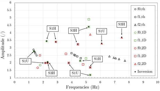Figure 8 combines the results reported in Figure 6 with the theoretical ones obtained under the assumption of an ideal viscoelastic homogeneous layer over a deformable substrate, highlighting the sites where a VS inversion was identified. Only the S1H site shows an amplitude that deviates significantly from the theoretical values in both types of numerical analysis within the fundamental frequency f0 range for the study. In the f1 frequency range, there is strong dispersion of the values, both in terms of the amplification levels and the type of numerical analysis. At the third frequency range f2, only the 2D numerical analysis is able to capture significant amplifications that exceed those in the theoretical case—but only at the two sites where a VS inversion is present.