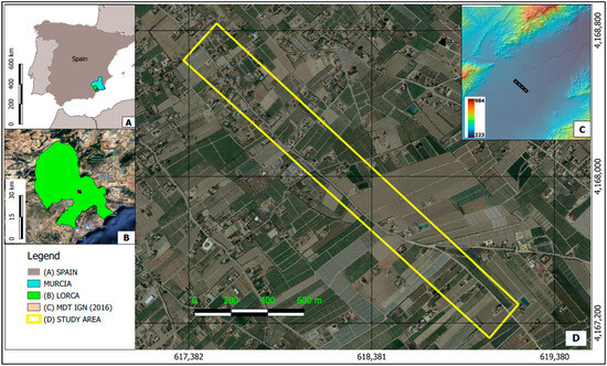 (A) Location of the study area in southeast Spain and location in the municipality of Lorca (green area) in the region of Murcia (yellow area); (B) location of the study area in the municipality of Lorca; (C) DTM obtained from ALS data downloaded from the IGN (National Geographic Institute) for 2016 [48]; (D) detailed location of the study area in Lorca along the road to Puente Alto, defined by the yellow rectangle. The geodetic reference system coordinates UTM 30N ETRS89.