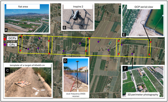 (A) Flat area study zone; (B) Inspire 2 UAV; (C) 60 × 60 cm template with reflective paint; (D) GNSS with tripod focused on the centre of the template; (E) the mark at a height of 120 m; and (F) an oblique photo taken on the perimeter.