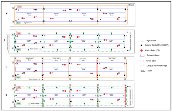 Photogrammetric scenarios analysed: (A) processing with forward strips only; (B) Scenario A combined with oblique perimeter images; (C) Scenario A combined with cross strips on the edges of each block at a different height; (D) Scenarios B + C.