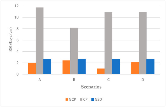 After obtaining the RMSE of the GCPs and CPs separately, as in Figure 4, the RMSE was calculated for each scenario. The results are shown in Figure 5. The maximum and minimum RMSE for the GCPs were found in Scenarios B and C with the values of 2.43 cm and 1.01 cm, respectively, and for the CPs in Scenarios A and B with the values of 11.73 cm and 8.16 cm. The GSD value was the same for all of the scenarios because all the flights were scheduled at the same altitude.