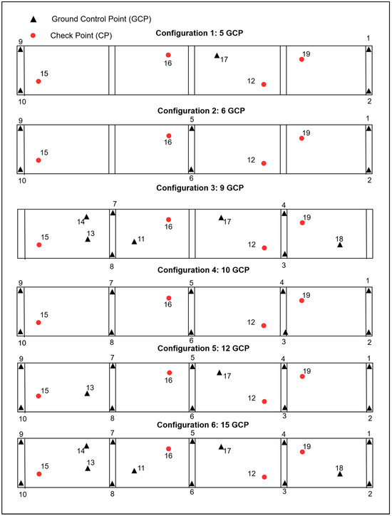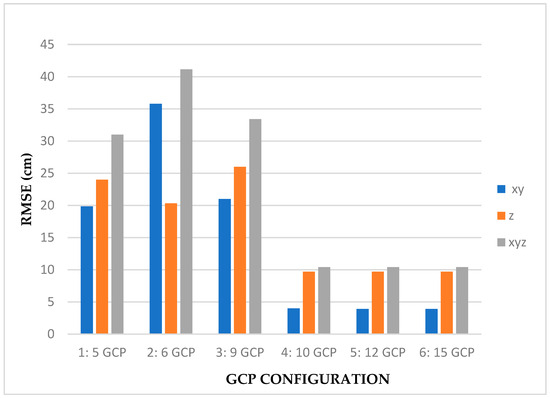 Although Configurations 5 and 6 had a higher GCP, the RMSE results did not decrease for Configuration 3, which essentially agrees with [69], which used six to seven GCPs well-distributed throughout the study area. The results were similar to those obtained using 15 GCPs. The same occurs in [70], in which an optimal GCP density was reached, and there was no further decrease in the horizontal and vertical errors.