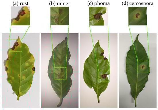 BRACOL, developed by Esgario et al. [22], consists of 1747 images of Arabica coffee leaves, of which 274 correspond to healthy leaves, while the rest contain one or more diseases. In addition, a subset was generated by cutting out symptomatic regions from the original images, so that each image contained only a single disease. This process resulted in a total of 1899 images of isolated diseases. The disease classes present in BRACOL include rust, miner, phoma, and cercospora, covering the main diseases affecting coffee cultivation. Some examples of images from the dataset can be seen in Figure 1.