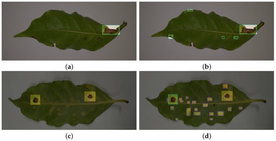 In order to more comprehensively evaluate the behavior of the models with the enhanced dataset, two samples were chosen from the test set for a qualitative analysis. Figure 6 shows the detection results in the samples using the model trained with the original dataset and with the enhanced dataset. In the predicted images, there are differences in the model’s detections. In Figure 6a, the model detected only two larger regions. On the other hand, in Figure 6b, the model detected smaller areas and a greater number of affected regions. In Figure 6c, the model correctly detected two regions. In Figure 6d, in addition to detecting the two regions found in Figure 6c, the model was also able to correctly detect the other diseased regions.
