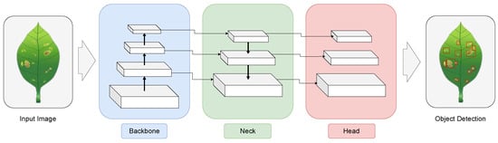 The YOLO family of architectures [33,34] has revolutionized object detection by introducing a unified and efficient approach. Unlike previous methods such as R-CNN (Region-Based Convolutional Neural Networks) and its variants, which divided the problem into several stages, YOLO models process the image in a single way, allowing for real-time detection with high precision. The architecture is made up of three main components: the backbone, the neck, and the head. Based on [35], the general flow of the YOLO architecture is illustrated in Figure 4.