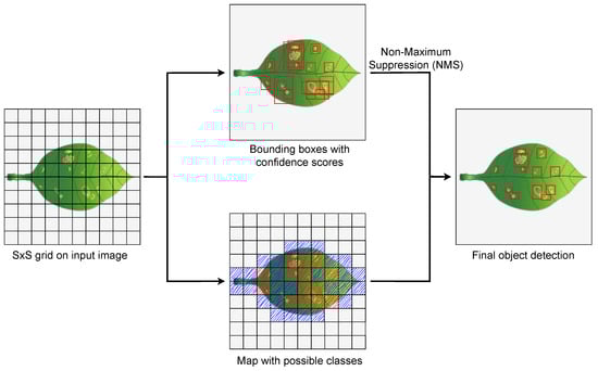 The operation of head is based on dividing the image into a grid, where each grid cell is responsible for predicting the presence of objects and their characteristics, such as position, size and class. This mechanism is represented in Figure 5, which highlights the process of subdividing the image and assigning detection responsibilities to the cells. After the bounding boxes, confidence scores and class probabilities have been generated by the head, the NMS is applied as a post-processing step to eliminate redundant or overlapping detections [35].