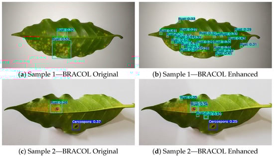 The BRACOL dataset was enhanced to maximize data quality and optimize model training. The Roboflow platform was also used for this. To ensure that all the markings were accurate, the original BRACOL annotations were reviewed and improved with the help of a plant pathology expert. This process included re-evaluating the existing markings, correcting any inaccuracies, and adjusting the bounding boxxes of the annotated areas. New markings were added to previously unidentified areas, increasing the representativeness of the dataset. Approximately 900 of the 1747 images were updated during this process, resulting in a substantial increase in total annotations from 1899 to 8226. This refinement aimed to provide a more comprehensive and reliable dataset for training object-detection models. Figure 3 shows two samples to exemplify the improvement of the dataset; in sample 1 of the original dataset only one diseased region was marked. When revised, four more diseased regions were marked. In sample 2, only two diseased regions were initially marked on the sheet, and after reviewing the markings, all the visible diseases were correctly marked. It can be seen that one disease was initially classified inaccurately.