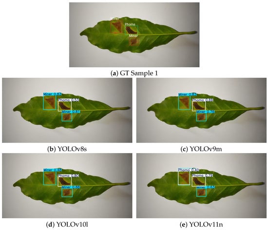 Figure 7 shows the ground truth (GT) of sample 1, containing two red markings indicating the presence of the miner pest, while a green marking indicates the region affected by the phoma disease. Also shown in the same figure are the visual results of disease detection in coffee leaves using the selected versions of YOLO. The bounding boxes indicate the regions detected, accompanied by the class labels and their respective confidence values. It can be seen that the YOLOv8s, YOLOv9m, and YOLOv10l versions have consistent results, with well-defined detections and relatively high confidence levels for both classes. In particular, YOLOv8s stood out for assigning high confidence to its predictions of the miner class, suggesting greater accuracy in detecting this particular disease. A similar behavior is shown by the YOLOv10l model and the phoma class. On the other hand, the YOLOv11n had its results compromised, showing a false positive in the detections for the phoma class.