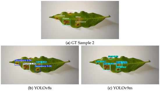 Figure 8 shows the ground truth (GT) of sample 2, with three orange markings for cercospora disease, a green marking for phoma, and a red marking indicating the presence of the miner pest. The same figure shows the results of automatic detection using different versions of YOLO. It can be seen that the YOLOv8s and YOLOv10l versions obtained better detections for the cercospora class, while the YOLOv9m version showed multiple false positives, confusing the cercospora disease with the rust class. The YOLOv11n model had difficulties detecting cercospora, recognizing only phoma and miner with moderate levels of confidence.