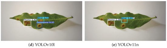 The qualitative analysis describes the performance of the YOLO models in visually detecting diseases and pests on coffee leaves. In Figure 7, Figure 8, Figure 9 and Figure 10, it can be seen that the YOLOv8s model showed consistency in the detection behavior of the four diseases, with well-defined bounding boxes and good confidence in the predictions, especially for the miner and rust classes regardless of the size of the location and the region affected. On the other hand, the YOLOv11n model showed difficulties in detecting cercospora and miner, generating predictions with low confidence and omitting some infected regions that were present in the ground truth. It was also observed that YOLOv9m had an intermediate performance, detecting instances of rust, but with low accuracy for the cercospora disease. YOLOv10l was also able to detect most instances of phoma and smaller regions of the rust class. However, the model showed some difficulty in differentiating cercospora from other diseases, as well as failing to detect larger regions of the rust class. In this scenario, the visual results reinforce the importance of a qualitative assessment complementing the quantitative analysis, highlighting the performance of YOLOv8s for detection.