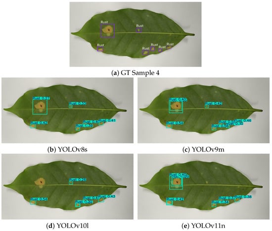 Figure 10 shows the ground truth (GT) of sample 4, where various regions of the leaf are marked, indicating the presence of the rust disease. The figure also shows the detection results using YOLO versions. It can be seen that the YOLOv8s and YOLOv9m models identified multiple regions with varying levels of confidence. The YOLOv10l model showed greater sensitivity when detecting smaller regions, but was the only one that failed to detect the largest region. YOLOv11n, on the other hand, correctly identified the disease occupying the largest region, which was detected three times. Also, the lack of detection of the smallest diseased region indicates the lower sensitivity of this model.
