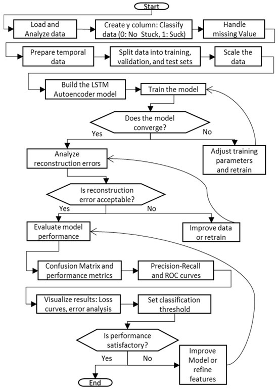 This section outlines the proposed methodology for stuck pipe detection using a long short-term memory (LSTM) autoencoder, the model architecture, the training process, and the evaluation metrics. Figure 2 illustrates the workflow of the LSTM autoencoder-based anomaly detection process, highlighting key steps from data preprocessing to model evaluation.
