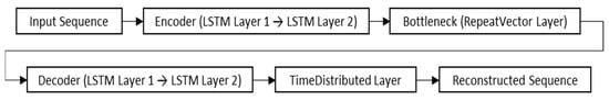 Training involves minimizing the autoencoder to minimize the reconstruction error and learn effective representations of normal drilling conditions. Hyperparameters like the learning rate, batch size, and layer architecture were optimized for improved performance. The Adam optimizer improved the convergence speed and avoided overfitting. Figure 3 illustrates the data flow through the LSTM autoencoder architecture, emphasizing the encoding, compression, and reconstruction process necessary for anomaly detection.