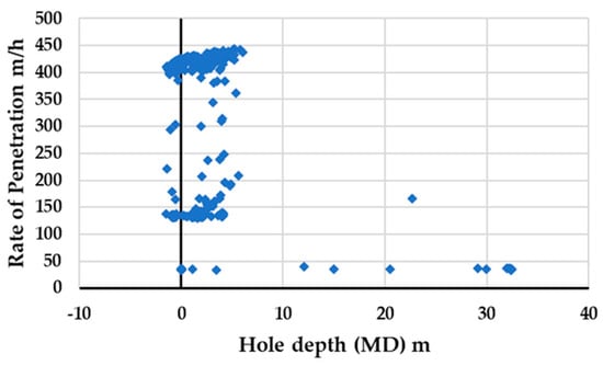 The analysis of the drilling parameters provides crucial insights into the relationship between operational conditions and wellbore stability. Figure 4 illustrates the correlation between hole depth and the rate of penetration, which reveals a general decreasing trend as the depth increases. Initially, the penetration rate exhibits significant variability, peaking at approximately 29.76 m/h at a depth of 376.89 m. However, beyond 380 m, the penetration rate stabilizes below 15 m/h, suggesting increased resistance due to lithological changes or operational adjustments.