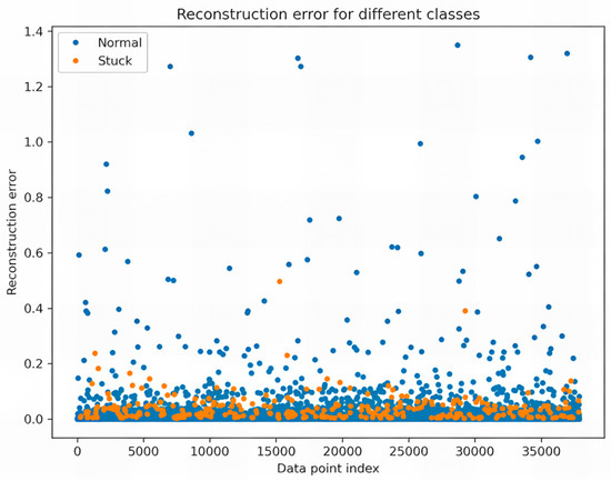 Figure 7 shows the reconstruction errors for different data samples. Normal cases exhibit lower reconstruction errors, while stuck cases show significantly higher errors, enabling clear separation between the two classes. Reconstruction errors help us distinguish between normal and stuck states; normal data points have reconstruction errors nearer to zero, whereas stuck cases present high errors, making them easily identifiable. This creates a clear separation, which is essential for generating class labels for specific instances to detect stuck events effectively.