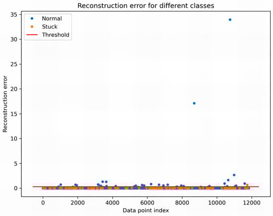 Figure 8 shows the distribution of reconstruction errors with a fixed threshold line at T = 0.3. This threshold is important, because it clearly separates normal and stuck data points. The data are almost linearly separable, with very marginal overlap, as illustrated in the figure. Although there are some false positives and false negatives, they are few and far between. By fine-tuning the threshold, the accuracy and precision of the classification accuracy can be improved, subsequently improving the model’s performance.