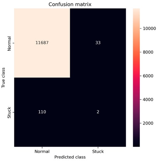 Figure 9 graphs the confusion matrix of the classification performance of the suggested LSTM autoencoder method. It plainly shows the ratios of the true classes and the forecast classes, providing valuable insights on how well the model is in capturing normal cases vs. stuck cases. The wrongly classified instances are those data points that fall below the diagonal line. This graph is necessary for evaluating the overall performance of the model and looking for potential areas of improvement in which the classifier is failing.