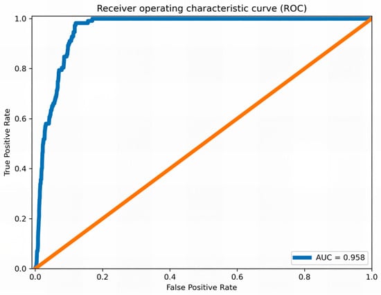 Two “Stuck” cases were correctly identified, while 11,687 normal cases were correctly predicted. However, 33 normal instances were incorrectly predicted as “Stuck”, and 110 stuck cases were misclassified as “Normal”. These results show that the model is highly effective in distinguishing between the classes, with very few false positives and false negatives. This accuracy indicates the method’s effectiveness in real-world scenarios, which helps to minimize classification errors. The receiver operating characteristic (ROC) curve is displayed in Figure 10. The text illustrates the model’s ability to differentiate between stuck and normal cases. The area under the curve (AUC) for the model is 0.958, which indicates excellent classification performance with the capacity to identify stuck events while maintaining a low false positive rate. This high AUC score emphasizes the model’s robustness and practical applicability in industrial operations, where effective anomaly detection is essential.