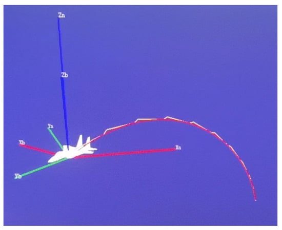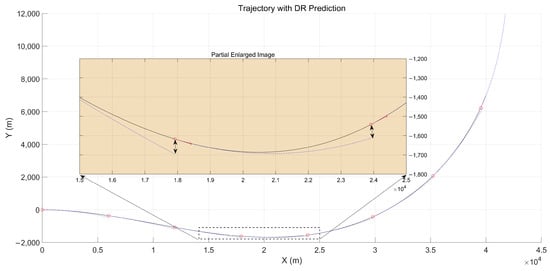 By projecting the trajectory onto a plane consisting of the vertical and x-axis, Figure 2 can be obtained, and the relationship between the line segments (the blue dashed lines) and the smooth trajectory (the black curves) calculated according to the second-order dead position can be seen. It can be seen that after the imminent large overload maneuver at 18,000 m, the maximum deviation in the vertical direction of dead reckoning reaches 75 m because the acceleration in the vertical direction is changing rapidly, even in reverse.