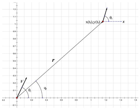 To facilitate the analysis and discussion, it is better to simplify the problem to the optimal guidance control in a two-dimensional plane. In Figure 3, the position at time t, namely , is located at the lower left corner. The angle between the moving velocity V and the horizontal axis of the coordinate system is . The azimuth angle is formed by the desired waypoint relative to the current position of the moving entity, and represents the velocity direction constraint when reaching the desired position in the constraints.