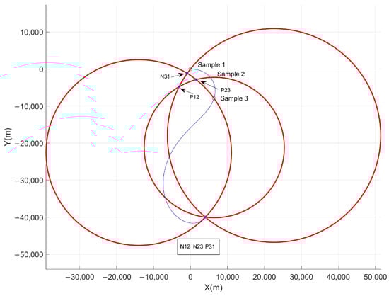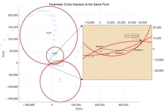 Firstly, the analytical solution of the intersection of two parameter circles is studied. For two sampling moments and , there are two parameter circles. Suppose the centers of the two circles are at and , and the radii are and , respectively. Thus, the midpoint between the two parameter circles is , and we define L as the distance in between and take the unit basis vector in the direction from one circle’s center to another, while the orthogonal unit basis vector is . Thus, the analytic solution of the two intersections in Equation (12) can be obtained.