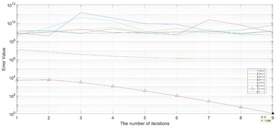 To verify the method proposed, the experimental design was structured in the following way. Firstly, a continuous system simulation was employed to obtain the motion trajectory under optimal guidance control (blue curves in Figure 6). Then, based on three sampling points, the 8B-PGDM method was applied, and the eight branches were optimized and iterated synchronously, and from the error convergence decline in Figure 7, it can be seen that the logarithmic curve of the seventh (–+) iterative error converges to the lowest point, and the corresponding cases of the branch line are the negative intersection of the first parameter circle and the second parameter circle (), the negative intersection point of the second parameter circle and the third parameter circle (), the orthogonal point of the third parameter circle and the first parameter circle (), and the error function (Lyapunov) when the termination condition occurs converges to . In contrast, the other branches do not have an optimal solution where the error converges to within the 0 neighborhood. And the estimated values of the parameter vector are [3998, −39,999, 1.0471].