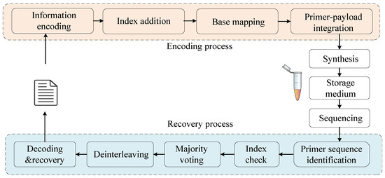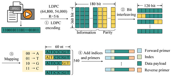 To address this challenge, we propose an encoding method optimized for hardware implementation. As shown in Figure 2, this scheme consists of the following steps. First, the binary data to be stored are divided into fixed-length blocks, and each block is encoded with LDPC codes for error correction. This step enhances the robustness of the data against errors introduced during storage and readout. Then, an interleaving operation is applied to the encoded codewords to enhance resistance against burst errors caused by sequence loss during storage. By redistributing bits across different positions, this step improves the error correction capability of the code in handling consecutive errors. Then, the interleaved codewords are segmented and mapped into DNA sequences using the following base mapping rules: (00) → A, (01) → T, (10) → G, (11) → C. Furthermore, to facilitate the identification of sequencing reads during the recovery process, unique index sequences are added to both ends of each DNA sequence. Finally, primer pairs are added to both ends of the sequence.