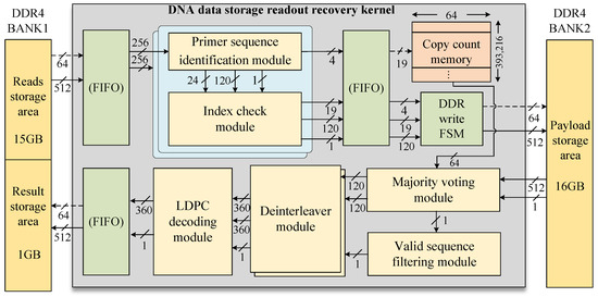 The FPGA-based DNA data readout hardware acceleration circuit was developed based on the proposed DNA storage encoding scheme. As illustrated in Figure 4, the hardware kernel utilizes off-chip DRAM for storing intermediate results and employs a two-stage pipelined architecture to optimize the read process. The first stage focuses on primer sequence identification and index checking, supporting the parallel processing of two sequencing reads. In this stage, the sequencing reads are stored in DDR BANK1, while the payloads obtained after primer sequence identification and index checking are stored in DDR BANK2. The second pipeline stage encompasses majority voting, valid-sequence filtering, deinterleaving, and LDPC decoding, and saves the decoded result in DDR BANK1. The memory read and write channels of the two pipeline stages are separated, effectively preventing data congestion and significantly improving overall system efficiency.